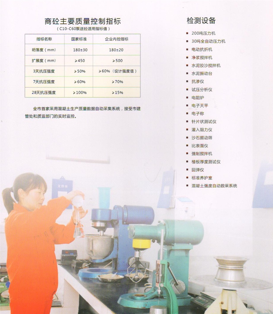 公司設(shè)有先進(jìn)的實驗室,配備全套混凝土及原材料檢測試驗設(shè)備,配有專職的試驗、檢驗人員,可承擔(dān)混凝土的材料性能試驗,工藝質(zhì)量控制、產(chǎn)品質(zhì)量檢驗等全部試驗、檢驗項目,為確;炷临|(zhì)量提供了可靠的保證。